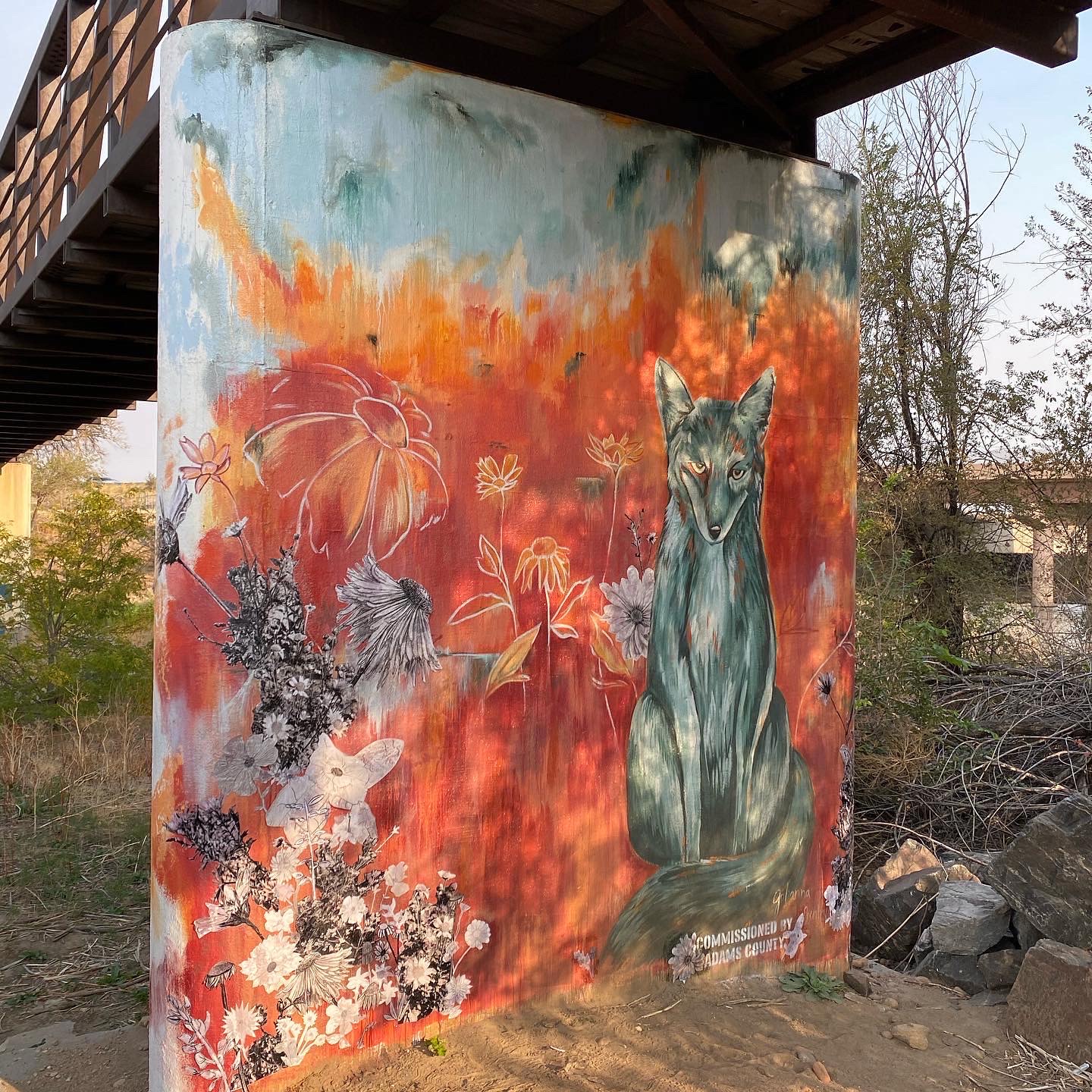 During the COVID-19 pandemic, Adams County began "Murals for Hope" as a way to invite their community outdoors. This (untitled) piece is one of 13 murals ( made by local muralists) along the Clear Creek Trail System and incorporates wheatpaste flowers created by my previous K-6 students.